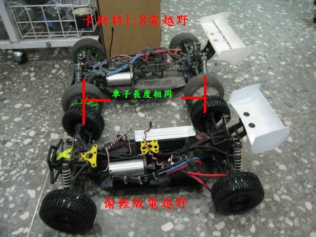 ![]() 哲大, 您配的電裝該不會是要去破百吧, 好像不太適合跑賽道ㄋㄟ, 感覺太暴了..... 既然是偷輕版, 我覺得應該配 90A電變+540size馬達+3S鋰聚, 這樣應該可以在輕個300克. 外觀上 胎 & 尾翼 少了一點1/8 buggy 的fu, 感覺小了一號, 也不夠粗曠. 期待您的試車報告... 給路人甲乙丙丁... 不要再問我全套多少錢 老子只做半套的啦!!!...XD | ||