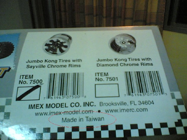 ![]() 輪胎我是在下面買的 http://www.hobbieguyrc.com/catalog/imex_jumbo_kong_tires_w_sayville_rims_2945614.htm運費 $74 很大箱跟水果箱一樣大 包裝上打者 made in taiwan. 不知道是哪一家工廠代工的... | ||