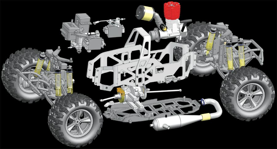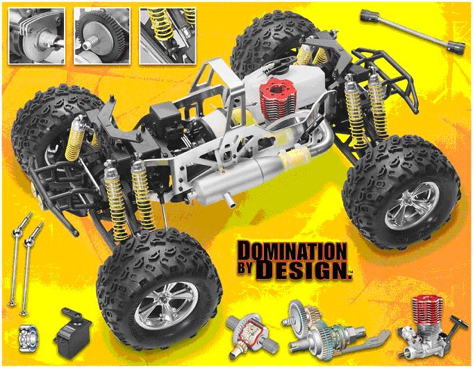 ![]() High Performance Features: • 7075 Aluminum Side Plates • 8 Rapid-TuneTM Aluminum Oil Shocks • Racing Aluminum Tuned Pipe • Starter Box Compatible • Huge Oversized Fuel Tank • Shaft Driven 4WD • Heavy Duty CV Drive-shafts • Adjustable Slipper Clutch • Dual Composite Disc Brakes • Aluminum Carrying Handle • Steel Turnbuckles • Metal Gear Differentials • Enclosed Radio Box • Fully Adjustable Suspension • Adjustable Body Mounts • Complete Bearing Set • Chrome Wheels (compatible with T-Maxx and Savage) | ||
