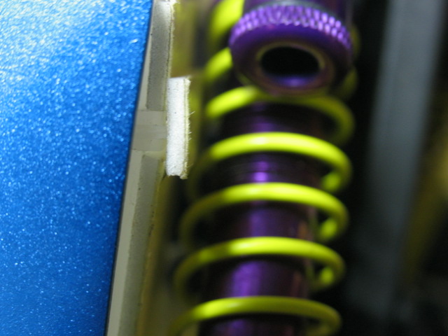 你好,避震也只是小改,试验一下,只是把螺丝上紧,让避震上的铝柱陷到支架里去,要真正改好,看来要把支架截掉一点才行.