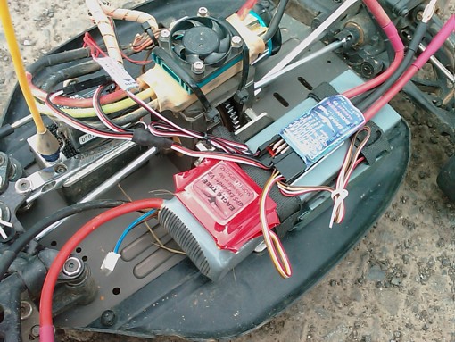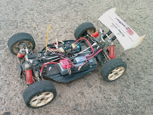 測試的結果發現車子的起步電流真的很大,但是原先以為很耗電的煞車確根本不怎麼耗電,原因應該是無刷馬達煞車是使的馬達三向短路並藉由短路的頻率改變馬達煞車的效果,另外採用高扭力的車用8極馬達雖然"小巧可愛",但是加速能力確超過最早使用的540XXL無刷馬達(2極,重量450g),加上重量減輕很多使得車子的馬力重量比提升很多,尤其在賽場實測8極馬達高扭力的效果更為明顯,遠雄車場正面的連續跳台跳台前"立定跳"都可以一次跳過兩個
