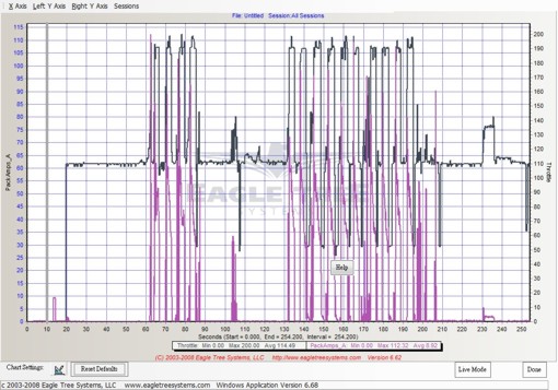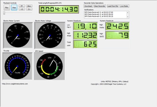 此次測試採用美國知名品牌Eagle Tree的E-Logger V3並搭配高速GPS定位器, 並採用1/10秒取樣一次的方式以期能得到最準確的數據,測試的地點的可用的直線加速距離大約是100公尺