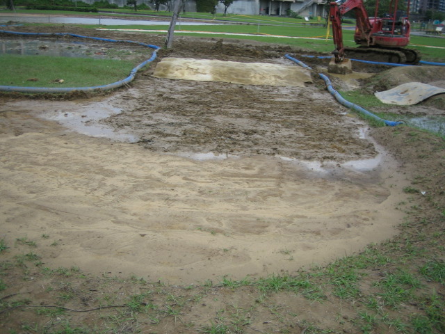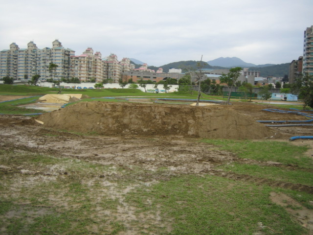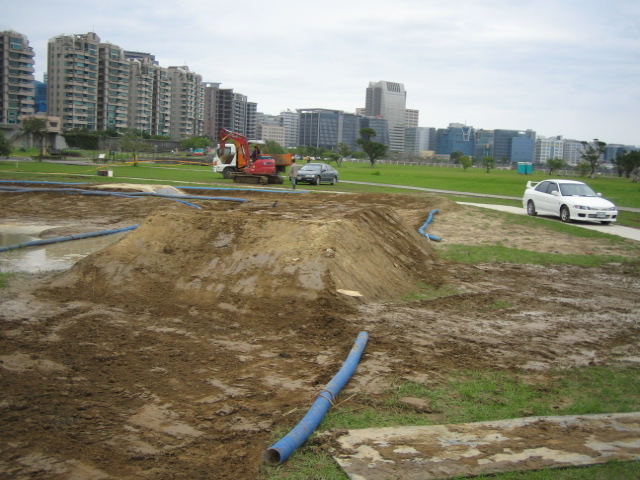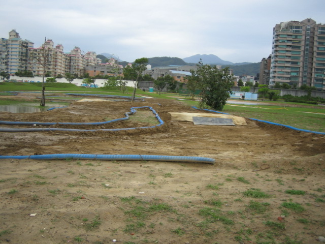![]() 今天補了幾處積水地方.後方跑道都加寬.感應器線管也埋設好.缺台抽水馬達.水沒抽星期六.日無法玩.上面腳踏車場積水太多都往車場流 | ||