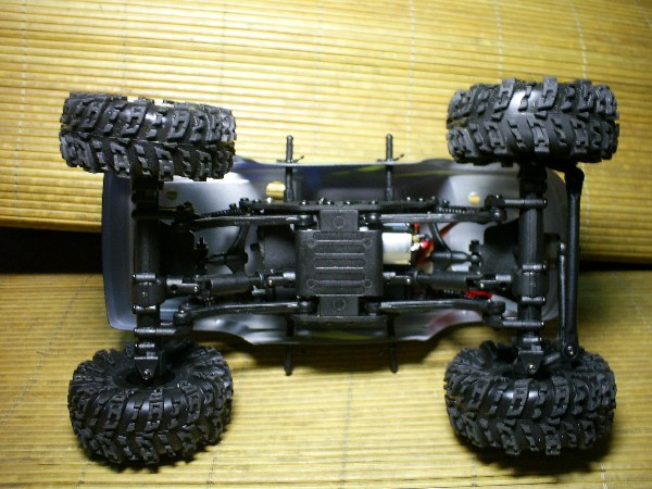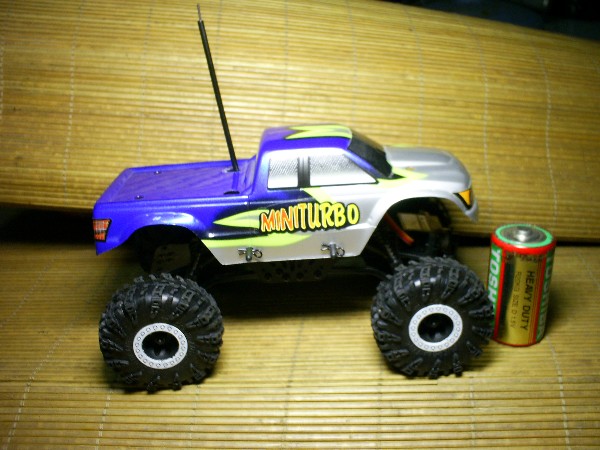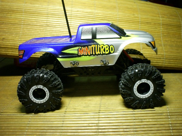 這規格比1/24還大蠻多的,蓋的是1/18的大腳車殼,依照這個軸距,輪寬應該是1/20