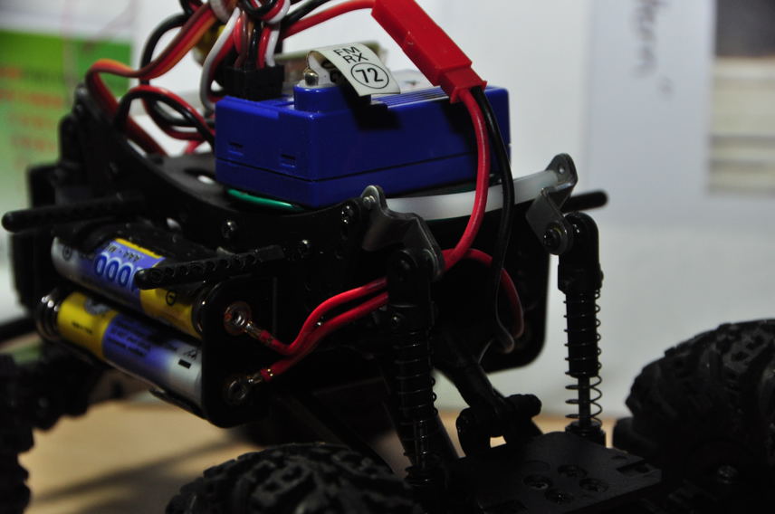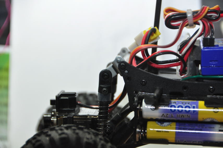![]() 前避震是直接在車架上面 看來要自己換殼會比較麻煩了 不過前避震改成這樣之後 角度比較垂直就比較不會卡卡的了 錢轉向伺服器也變成倒放 空出一個平台,可是上面又凸起兩根 要放東西也不好放,到時候電裝的配置可能又要大傷腦筋了 | ||