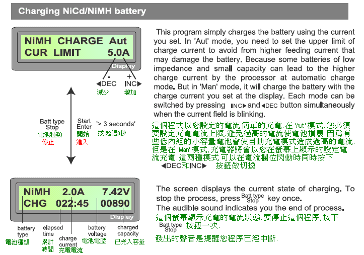 ![]() 該內容引用 h53021 在 2008/6/18 下午 10:56:43 發表的內容: 大大 USER SET PROGRAM 裡面的 NIMH Sensitivity D.peak Mv/Cell 它可以1~20Mv/Cell &Default 這兩個是設定什麼的? 鎳氫電池的設定需要注意哪些設定? 感謝大大提供讓我懂很多!!!超級感恩 那個應該是峰值壓降.一般鎳鎘設12mv.鎳氫設7mv 鎳氫標準值1cell是1.2v.充飽1.45v.充電電流是1~2c 樓樓上前輩好厲害.有那麼清楚的中文說明書.... ![]() ![]() | ||