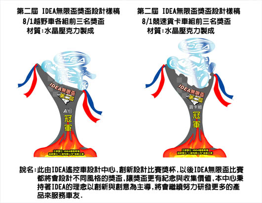 此為獨創設計之新型式獎杯,一層不變的獎杯看了會膩,每次拿的都是一樣,本中心將在以後辦的IDEA無限盃之比賽都會有不同的形式獎盃設計,自家設計,別的比賽沒有的喔!!為感謝車友大家對車場的支持,我會更努力的把比賽辦的更精彩,希望大家給我更多的支持.