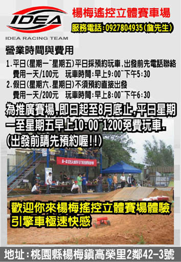 本IDEA楊梅車場,為推廣賽場,從即日起至8月底止,2個月時間星期一至星期五早上10:00~12:00免費玩車(因我個人業務繁忙,我現在沒有每天到車場,所以平日要玩車請先電話預約)假日一定會在,假日不須預約.