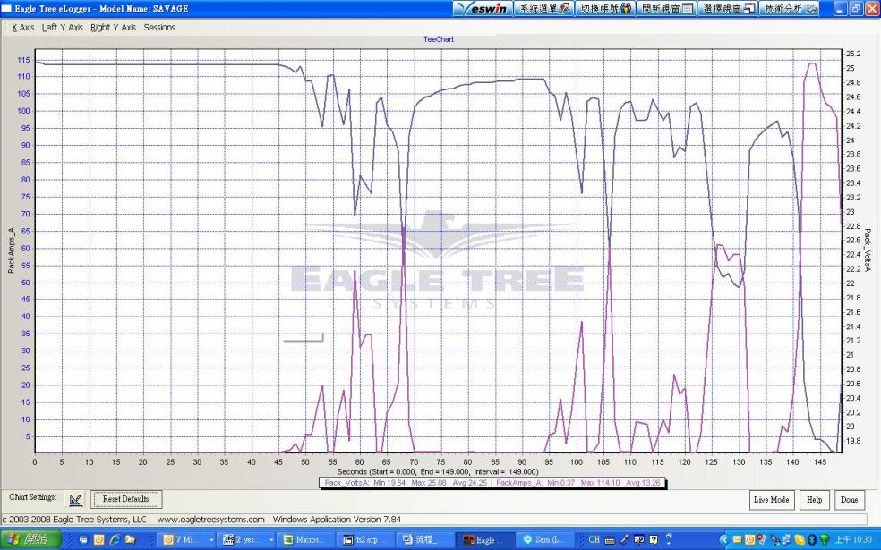 ![]() 我是覺得太重拖了. 一般最大電流只會出現在起步時的短短幾秒, 穩定後就會大幅降下. 但是你的電流居然大到 115Amp, 而且100Amp以上的時間還持續了將近7秒...不太正常. 電池的放電C數也不太夠, 倒數3秒前已跳保護. Peak power = 115Amp x 19V = 2185W (老鷹樹的AP也會計算出此值). 給路人甲乙丙丁... 不要再問我全套多少錢 老子只做半套的啦!!!...XD | ||