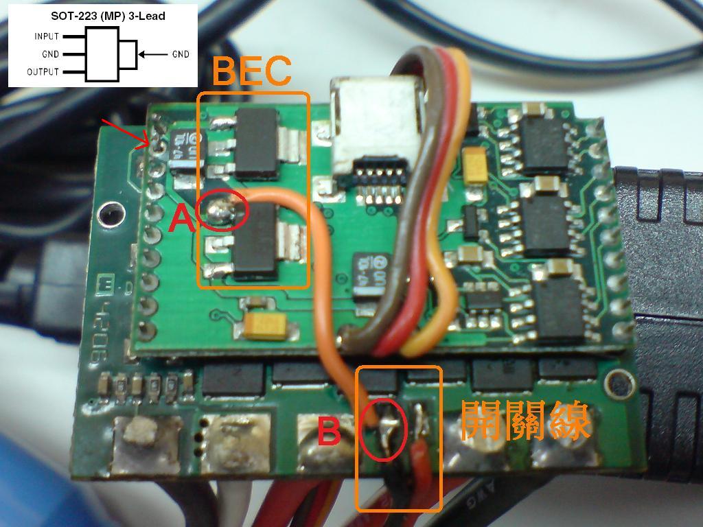 ![]() 之前忘了交代電變燒掉的原因, 補充說明一下: 當"接收使用外接電源" 且 "電變到接收的接線未將電源移除" 時將會有好玩的事情發生. 有興趣的玩家可以試試上述接法, 電變不需要接電池就能正常操作, 甚至馬達還能轉. ***但是千萬不要重催油門, 不然就會跟我一樣*** 這顆電變的電源設計有漏電問題, 會從BEC 的 Output漏到Input, 等效Vf=0.6V @ Noload. 所以接收電池透過接收機接到電變, 再透過BEC漏到電變電池. 當車輛操作中, 又剛好電變電池鬆脫, 即有可能燒電變. FYR. 給路人甲乙丙丁... 不要再問我全套多少錢 老子只做半套的啦!!!...XD | ||