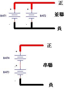 ![]() 串聯就是正極接負極、負極接正極 並聯就是用電線將正極接正極、負極接負極 串聯的電力比較大--並聯是跟原本的電力一樣.但是使用時間會比較久 丫偉 | ||