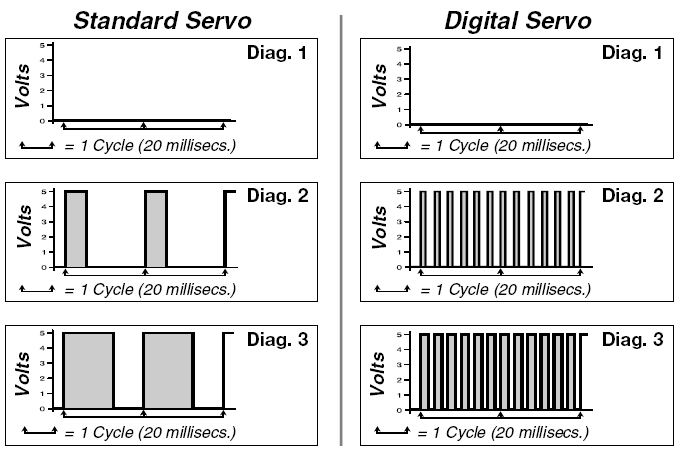 ![]() 數位式伺服機 比 標準式伺服機 來的耗電, 原因是因為數位式的馬達驅動部份 與核心電路在收到訊號後,每秒約 50~120次的動作,這動作一直到定位點為止.. 如上, 標準式伺服機就沒有這樣的電路,而是用10~20ms 次的比較式電路直到定位. 貼一張圖瞧瞧2者不同: ![]() so.. 兩相比較, 數位式會在單位時間內消耗較多的電流, 但好處卻不少,如,快速的起動時間,較精密的定位點..等等. 但是, 它也有一點致命傷, 就是不可以長時間的 死點 運作, 死點就是機構干涉.這會加速 馬達與FET驅動部的燒毀. BEC 也不一定, 那要看BEC能耐多大電流吧, 這方面我玩的就不多, 因為我從未買過原場接收機.. 不過, 我認為 在有BEC的接收機上裝2棵數位servo, 同時運作,電流會很大.. BEC電路也會很燙..所以我猜想應該有些是沒有BEC的吧. | ||