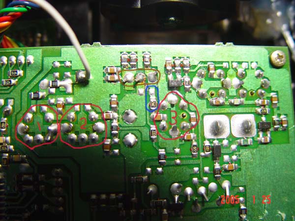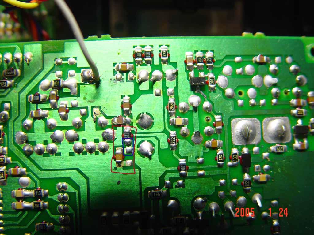 ![]() Ans: 1. 藍色的那不是限流電組喔, 那是電晶體的 "基極" B. 這個不能動它. 2. 在左邊的那兩棵(照的不清楚,看不到號碼) 才是.,2SC4735 這棵電晶體有約 0.9W at 12V 的實力., 要擠出滿檔恐怕不多..,與其焊電阻, 不如把它短路, 但改後開機一定要拉長天線!!! 3. 調整順序 3 -> 2 -> 1. 其它不要動. 4. 72Mhz頻帶相同. | ||