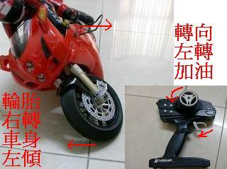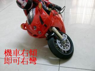 3.遙控器右轉,機車是右傾,前輪是向左。
